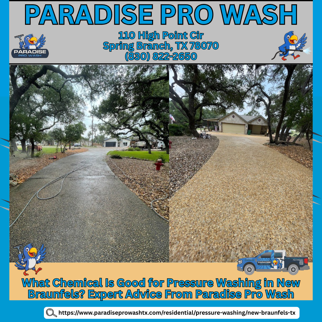 What Chemical Is Best for Pressure Washing in New Braunfels, TX? Expert Advice From Paradise Pro Wash When it comes to pressure washing in New Braunfels, TX, choosing the right chemical makes all the difference. Our warm Texas climate and seasonal humidity create ideal conditions for mold, mildew, algae, and organic stains to grow on exterior surfaces. The most effective solution for removing these contaminants is sodium hypochlorite — the primary chemical Paradise Pro Wash uses to deliver safe, long-lasting results. Combined with professional application techniques and high-quality surfactants, sodium hypochlorite restores exterior surfaces without causing damage. It doesn’t just brighten what you see — it eliminates growth at the source for results that last. Homeowners throughout New Braunfels rely on professional pressure washing because chemical selection — not raw pressure — determines success . Below, we explain why sodium hypochlorite works so well, how it’s applied, and why expert handling matters. Why Chemical Choice Matters for New Braunfels Properties New Braunfels experiences warm temperatures, occasional humidity, and plenty of outdoor exposure — conditions that allow algae, mold, and mildew to spread across siding, driveways, roofs, patios, and pool decks. Water alone can’t remove these contaminants at the root. Professional pressure washing in New Braunfels relies on specialized cleaning solutions that break down biological growth safely. This approach reduces the need for excessive pressure that can damage surfaces and ensures a deeper, longer-lasting clean. Sodium Hypochlorite: The Most Effective Cleaning Solution Sodium hypochlorite is widely regarded as the industry standard for exterior cleaning. It works by breaking down mold spores, algae, and mildew at a molecular level, ensuring stains are fully removed rather than temporarily lightened. At Paradise Pro Wash , we use carefully formulated sodium hypochlorite mixtures that maximize cleaning power while preserving surface integrity. This balance is critical for achieving professional-grade results without discoloring or degrading materials like wood, concrete, stucco, or siding. The Role of Surfactants in Professional Pressure Washing Surfactants are essential additives in professional cleaning. These agents allow chemical solutions to cling to surfaces longer, especially on vertical areas like walls and screen enclosures. Without surfactants, solutions wash off too quickly and lose effectiveness. That’s why reputable New Braunfels pressure washing companies include them as part of a complete cleaning system. Are Other Chemicals Used in Pressure Washing? While sodium hypochlorite handles organic growth effectively, certain stains require different treatments. Certified pressure washing professionals may also use: Degreasers for oil and automotive stains Mild acids for rust or fertilizer discoloration Gentle detergents for delicate surfaces A trained technician evaluates each surface to determine the safest and most effective solution. Trusted pressure washing providers never use overly aggressive chemicals without need. Why DIY Chemical Use Can Cause Damage One of the biggest risks with DIY pressure washing is improper mixing and application. Strong solutions can bleach paint, damage landscaping, corrode aluminum, or weaken concrete. Weak solutions, on the other hand, fail to fully remove contaminants, leading to rapid regrowth. Paradise Pro Wash applies chemicals using precise ratios, controlled dwell times, and professional application methods to ensure effective cleaning without damage. Different Surfaces Require Different Chemical Strengths Not all exterior surfaces respond the same to cleaning products: Roofs require low-pressure soft washing Driveways and concrete may need stronger solutions for embedded algae Vinyl and stucco siding require careful dwell control Experienced New Braunfels pressure washing technicians understand these distinctions and adjust their approach to protect every surface. Environmental and Property Protection Practices Professional pressure washing isn’t just about cleaning — it’s about protection. Paradise Pro Wash prioritizes landscaping safety, controlled runoff, and thorough rinsing on every job. Our approach ensures cleaning solutions work effectively without harming plants, pets, or surrounding materials — a key factor homeowners should consider when choosing a service provider. How Long Do Professional Results Last? When sodium hypochlorite is applied correctly, results last significantly longer than water-only cleaning. By eliminating growth at the root, surfaces stay cleaner for months, reducing maintenance frequency. Routine service from a trusted New Braunfels pressure washing company helps maintain curb appeal and protect property value. Why Homeowners Trust Paradise Pro Wash Paradise Pro Wash is known throughout New Braunfels, TX, for expert chemical application, dependable service, and outstanding customer care. Our deep understanding of local conditions ensures every cleaning solution is tailored for durability and safety. Every project is backed by experience, training, and proven methods — never guesswork. Schedule Your Professional Pressure Washing Service Choosing the right chemical is only part of achieving a truly clean exterior — the real results come from expert application and property protection. Homeowners dealing with algae, mildew, or stubborn staining can rely on Paradise Pro Wash for safe, effective solutions tailored to New Braunfels’ climate. 📞 Call us today to schedule your pressure washing service with confidence! (830) 822-2650
